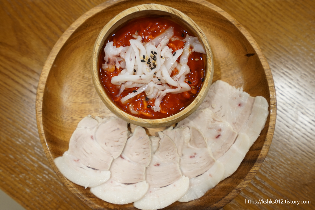 먼저 돔베 냉수육과 한치 초무침이 한 접시에