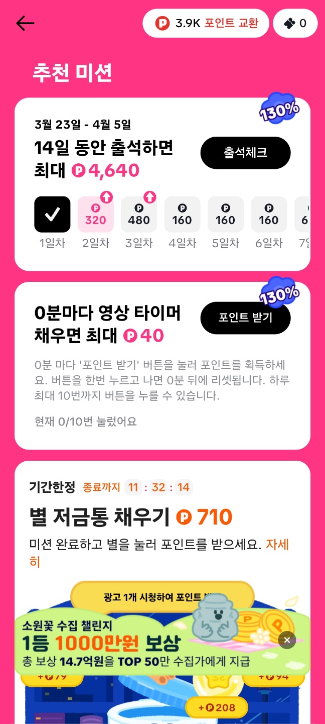 처음에는 출석 체크도 포인트 미션도 금액이